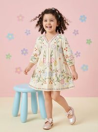 Charming pastel cotton dress with textured fabric and multi-colored design. Lightweight and comfortable for everyday wear, playdates, and casual outings.